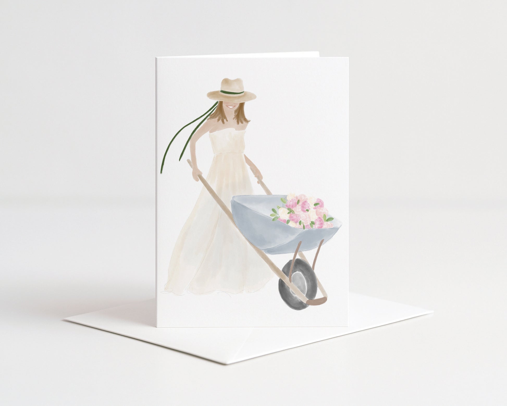 Bring beauty to the everyday with this premium greeting card, featuring original watercolor artwork by Aimee Sicora. This hand-painted whimsical card, featuring a beautiful flower lady with her wheelbarrow, is sure to bring a smile to the recipients face.